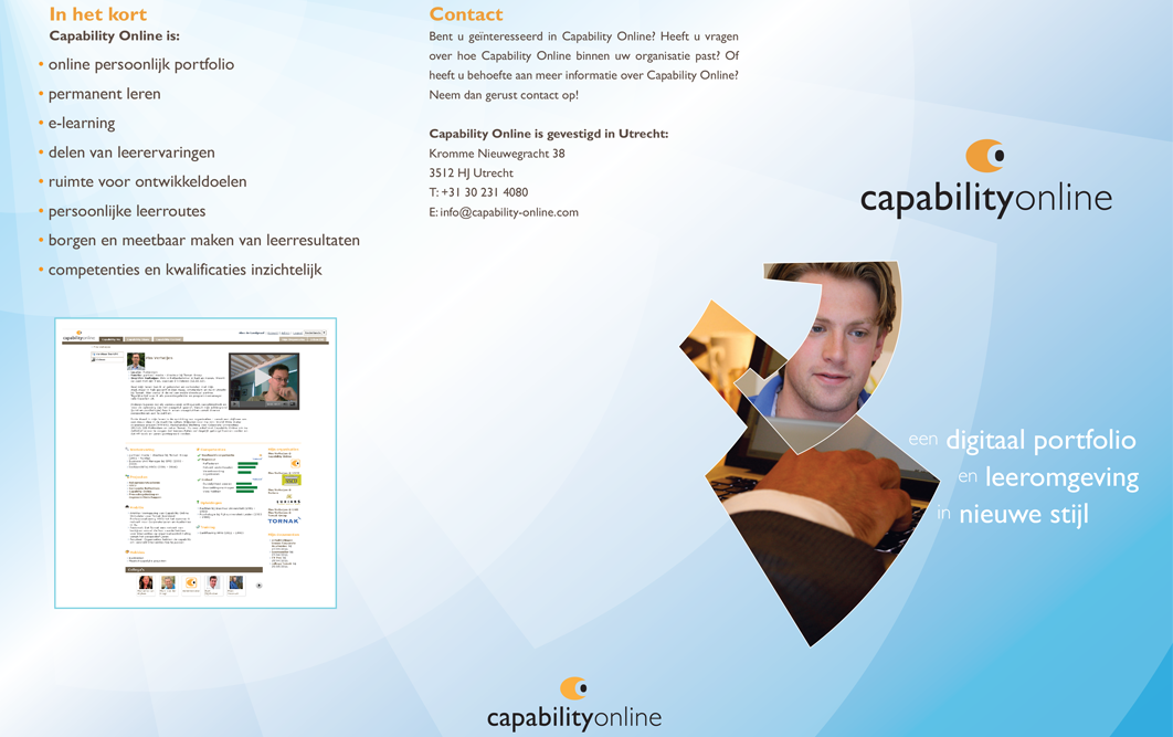 Djuzz verzorgde voor Capcloud/Capability Online de allereerste productbrochure. Ik was verantwoordelijk voor zowel de grafische vormgeving als de tekstuele zaken. Inmiddels zijn het bedrijf en de diensten aanzienlijk veranderd en is de brochure van mijn hand niet meer in deze vorm in gebruik.
