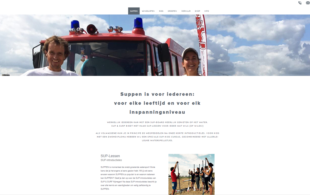 Djuzz schreef voor SUP & SURF Nijmegen de teksten voor de tijdelijke website én de nieuwe website. Door middel van telefonisch overleg en mailcontact is er efficiënt afgestemd welke stijl en sfeer de teksten moesten hebben. Zo kon de nieuwe website op tijd in de lucht voor het hoogseizoen.